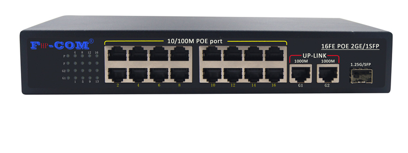 16個百兆PoE供電端口,兩個千兆上聯端口,一個千兆上聯光口,內置電源(AC100-265V輸入),PoE輸出總功率為200W