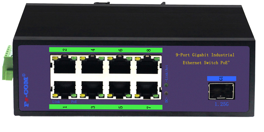 8路千PoE電口+1路千兆SFP光口工業級以太網PoE交換機,支持8個10/100/1000Base-T(X)電口和11000Base-X光口。產品符合FCC、CE標準。FIG18P-SFP交換機具有-40℃~85℃的工作溫度,具有超強的堅固度能適應各種嚴苛環境,也可以非常方便的安置在空間緊湊的控制箱中。導軌的安裝特性、寬溫操作及擁有IP40防護等級的外殼及LED指示燈,使FIG18P-SFP成為一個即插即用的工業級設備,為用戶的以太網設備聯網提供可靠、便捷的解決方案。