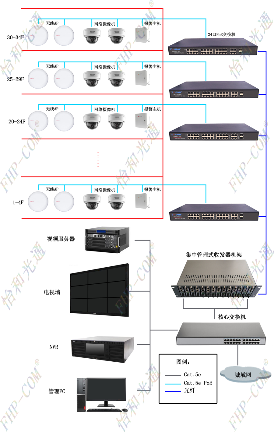 2、樓層PoE交換機通過光纜連接到集中管理式收發器機架,再傳至核心層交換機;